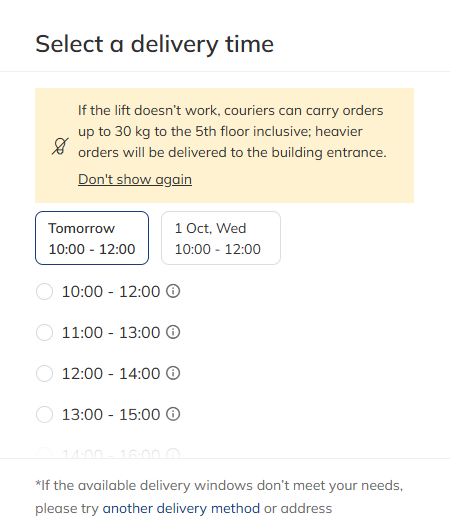 Please note: information about the conditions for delivery to the floor is always displayed on our website during order placement and time slot selection.