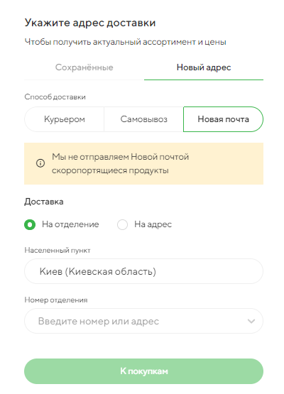«Новая Почта» по Украине: Доставка в любое отделение, почтомат или курьером на Ваш адрес по всей стране. Важно: Этот способ доступен для ограниченного ассортимента товаров (срок годности > 30 суток, не требуют спец. температурного режима). Срок хранения в отделении – 5 дней.