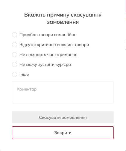 Ми цінуємо Вашу гнучкість і надаємо Вам повний контроль над замовленням. Ви можете легко скасувати його самостійно на більшості етапів: «Прийнято», «Збирається» та «Зібрано».