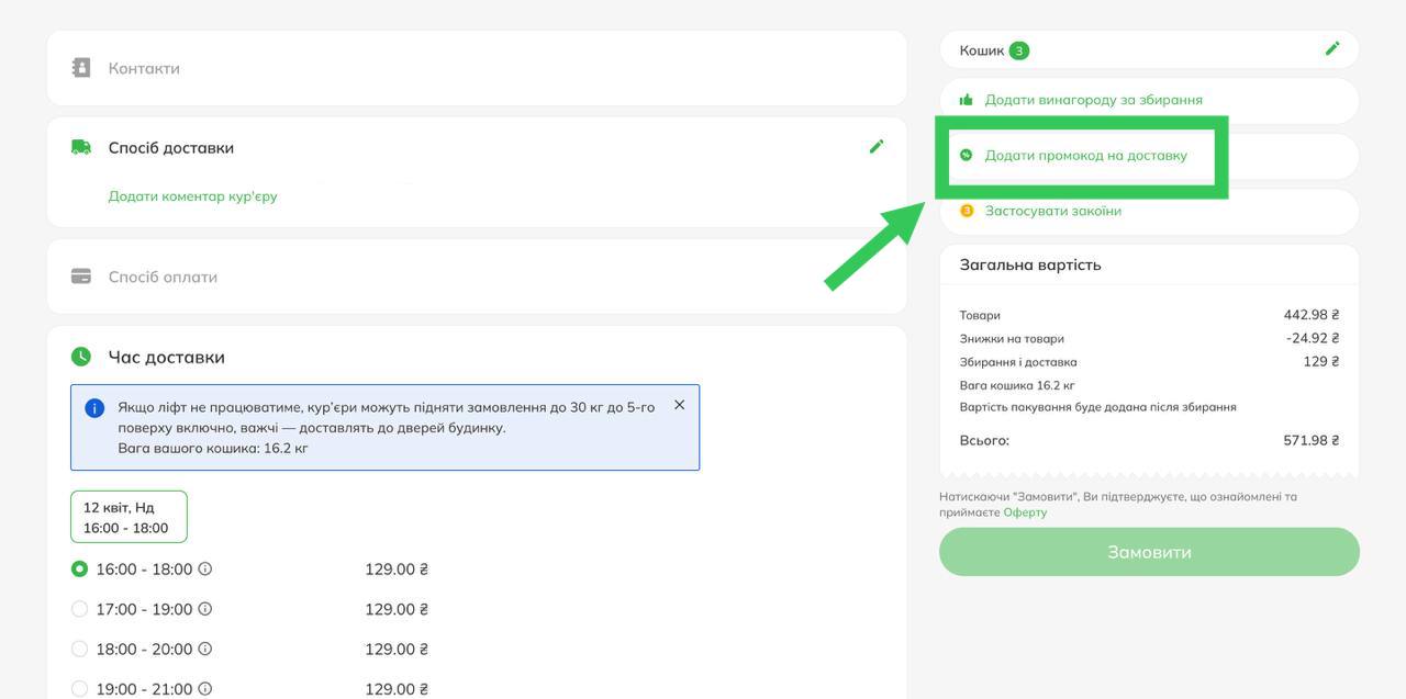 Просто введіть ваш код у спеціальне поле на сторінці оформлення замовлення, і знижка буде автоматично застосована до вартості доставки.